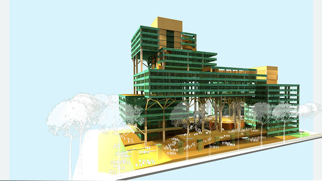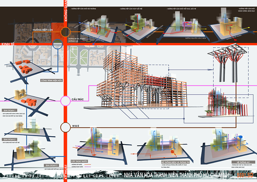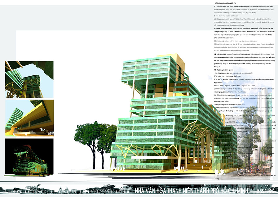 Một sân chơi hiện đại ngang tầm, biểu tượng và lòng tự hào của thanh niên thành phố phải là một tổ hợp kiến trúc chứ không phải là một công trình kiến trúc đơn thuần. Một tổ hợp kiến trúc hàm chứa ý nghĩa quần tụ và thu hút, mời gọi giới trẻ (đối tượng) của mình hướng đến. 2. Tính đa hướng của một không gian thị giác thống nhất: Là giải pháp căn bản để xử lý: - Lối ra vào và thoát người nhanh chóng cho nhiều công năng độc lập tương đối. - Không gian trống trung tâm là hạt nhân nối kết không khí quần tụ sôi nổi và linh hoạt cho tổ hợp kiến trúc. - Hài hòa và nối kết cảm giác thoáng đãng với không gian trống lân cận của những công trình và đường phố. - Làm nhẹ nhàng đi một mật độ công năng rất lớn của Nhà Văn Hóa trên khu đất không lớn. Diện tích khu đất: 15.360m2 Diện tích sàn: 90.000m2